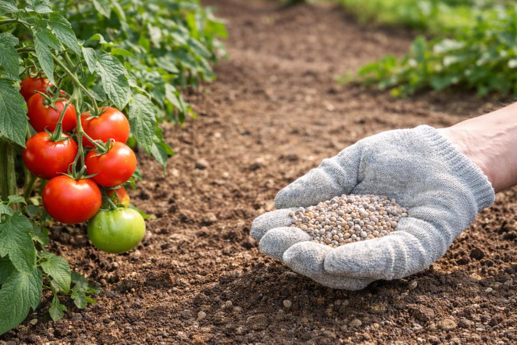 トマトは葉ばかり茂ると実つきが落ちやすいので、窒素だけを強くしすぎないのがポイントです。リン酸やカリウムもバランスよく入るタイプを選ぶと調整しやすいです。追肥の位置も、株元ではなく少し外側に。根が伸びた先に効かせると、安定して吸ってくれます。